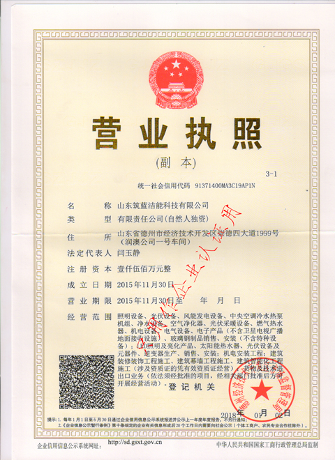 山東筑藍(lán)潔能科技有限公司創(chuàng)建于2015年,擁有建筑業(yè)企業(yè)資質(zhì)證書(shū)--城市及道路照明工程專(zhuān)業(yè)承包叁級(jí),是一家集設(shè)計(jì)、生產(chǎn)制造、安裝服務(wù)于一體的新能源企業(yè),專(zhuān)業(yè)從事太陽(yáng)能路燈、LED路燈、高桿燈、庭院燈、景觀燈、中華燈、草坪燈、光伏設(shè)備、風(fēng)能發(fā)電設(shè)備的生產(chǎn)及銷(xiāo)售、安裝及售后服務(wù);同時(shí)還從事凈水設(shè)備、空氣凈化器、光伏采暖設(shè)備、燃?xì)鉄崴、機(jī)電設(shè)備、玻璃鋼制品的銷(xiāo)售、安裝,LED照明及亮化產(chǎn)品、太陽(yáng)能熱水器、光伏設(shè)備及元器件生產(chǎn)、銷(xiāo)售、安裝;建筑裝飾裝修工程施工、兼建筑幕墻工程施工、建筑智能化工程施工等產(chǎn)品專(zhuān)業(yè)生產(chǎn)加工的公司,擁有完整、科學(xué)的質(zhì)量管理體系。